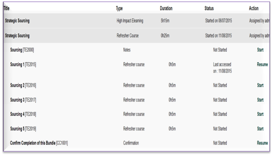 After Scenario Based E-Learning individuals go through a very concise summary of key principles. For example the screenshot below (taken from the CIPP/CIAPP online certification program schedule), shows e-courses on strategic sourcing are 5 hours & 15 minutes of scenario-based e-learning, whereas refreshers are only 25 minutes.